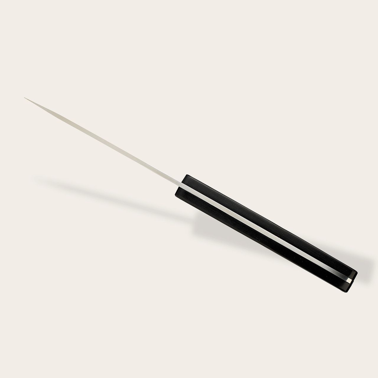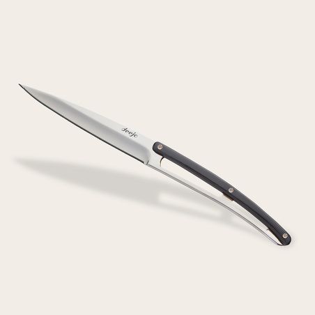 Le bois d’ébène qui orne le manche de ces couteaux Deejo est une véritable ode aux noirs profonds. Cette essence de bois exceptionnelle a la particularité d'être pratiquement insensible à l’humidité ambiante. Elle s’avère ainsi être ainsi la plus dense, la plus résistante et la plus précieuse qui soit, idéale pour ces magnifiques pièces de coutellerie.