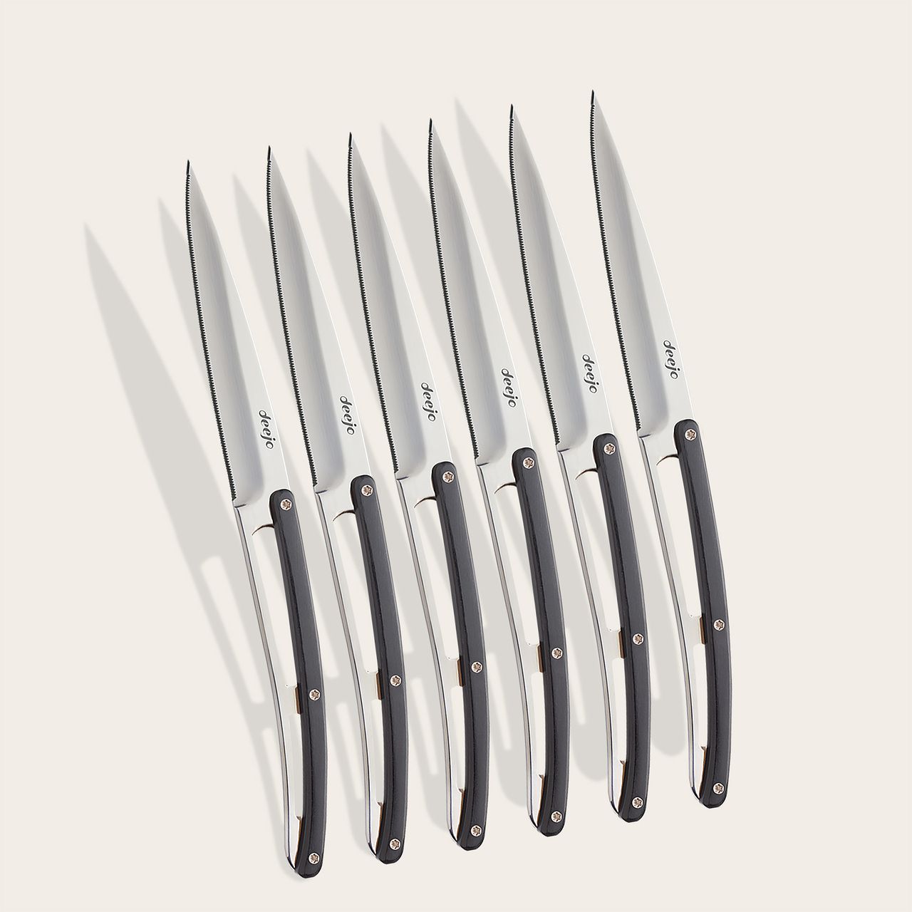 Ensemble de 6 couteaux de table "Prestige" à lame fixe (non pliant) microdentée en acier inoxydable 2CR14, finition miroir Manche en Ebène.