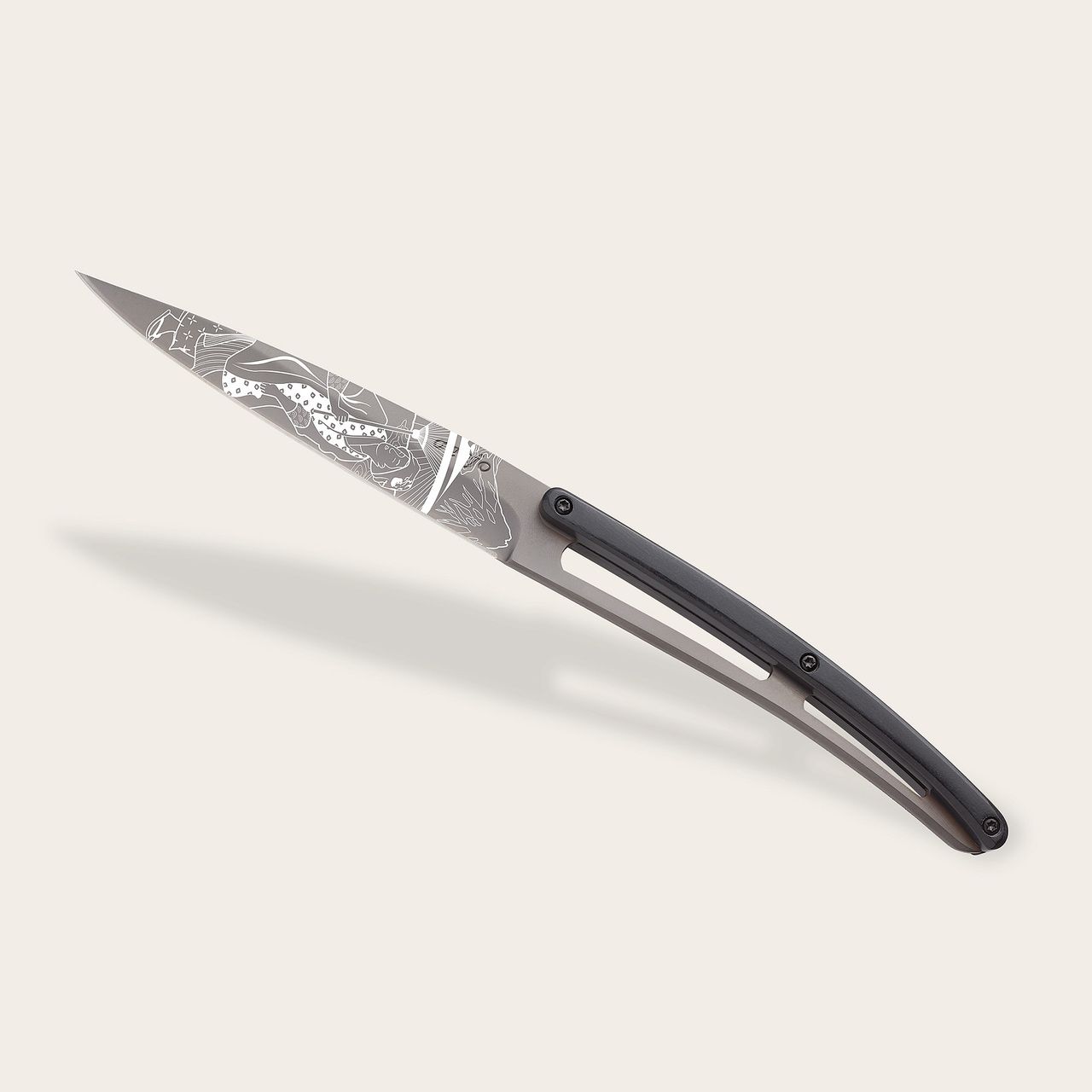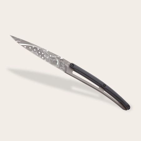 Le bois d’ébène qui orne le manche de ces couteaux Deejo est une véritable ode aux noirs profonds. Cette essence de bois exceptionnelle a la particularité d'être pratiquement insensible à l’humidité ambiante. Elle s’avère ainsi être ainsi la plus dense, la plus résistante et la plus précieuse qui soit, idéale pour ces magnifiques pièces de coutellerie.