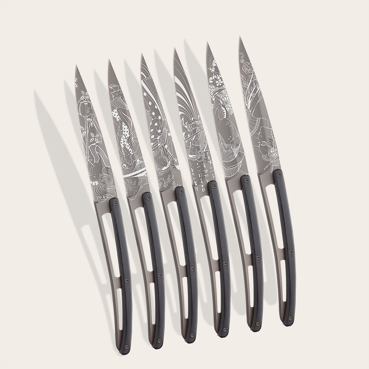 Mélange subtile de tradition et de modernité, votre set de 6 deejo de table arborent dans une même harmonie un tatouage différent sur chacune de ses lames à l’attention de chaque convive. Un détail de plus, si besoin était, pour être au centre des conversations et susciter bien des convoitises…