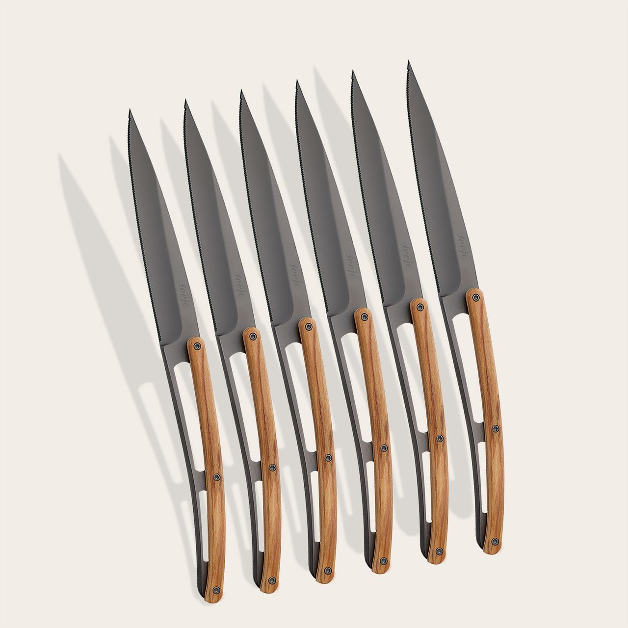Ensemble de 6 couteaux de table "Prestige" à lame fixe (non pliant) microdentée en acier inoxydable 2CR14, finition titane. Manche en Olivier.