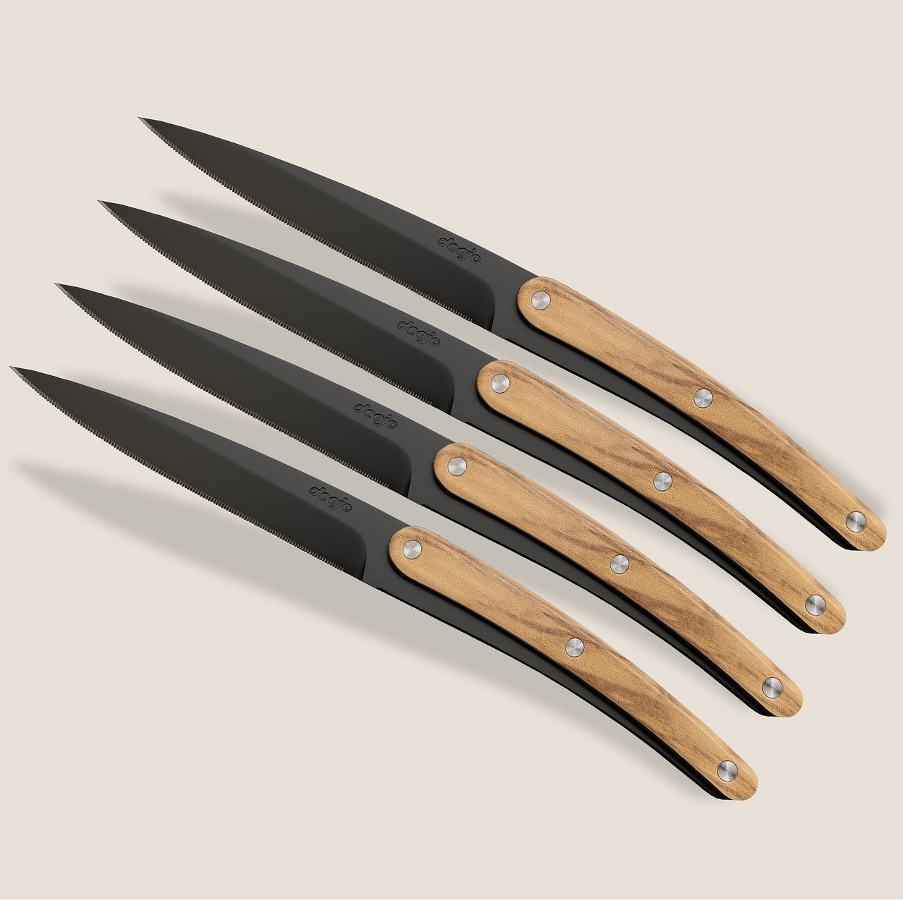 Les couteaux sont présentés par quatre dans un écrin d’une élégance rare, pensé comme un prolongement de l’esthétique Deejo.