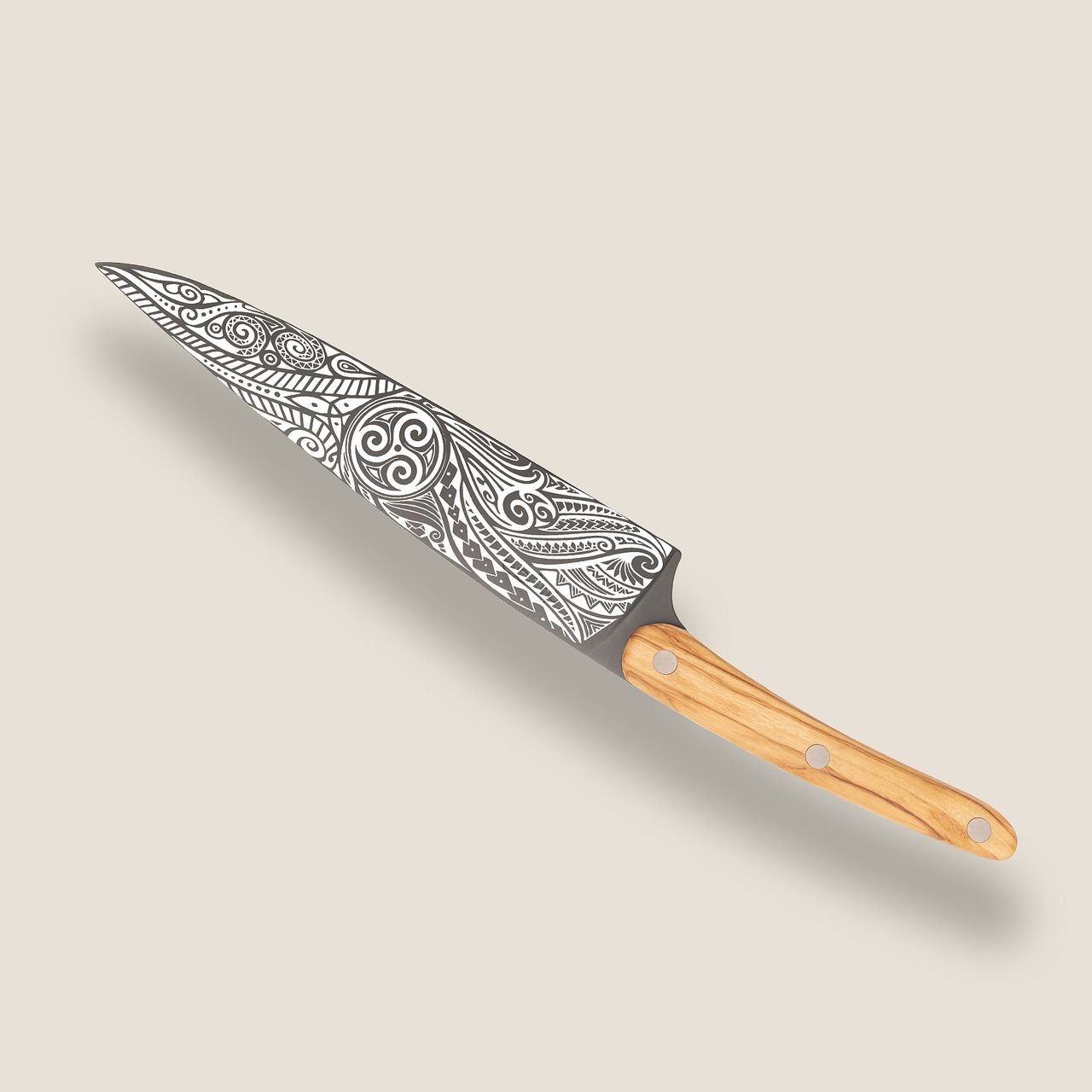 Fidèle à l’ADN Deejo, la beauté n’est pas un supplément d’âme : le manche en bois d’olivier massif, aux arabesques de beige et de miel, dialogue avec des tatouages exclusifs gravés sur les deux faces. Ces motifs ne décorent pas : ils signent une philosophie, remettre du sens et de la contemplation dans l’usage.