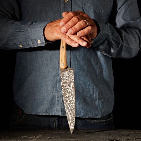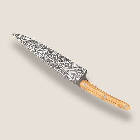 Couteau de cuisine pleine soie. Lame en acier inoxydable X50CRMOV15 décoré d'une fine gravure au laser. Finition en titane gris anthracite. Manche en bois d'olivier riveté.