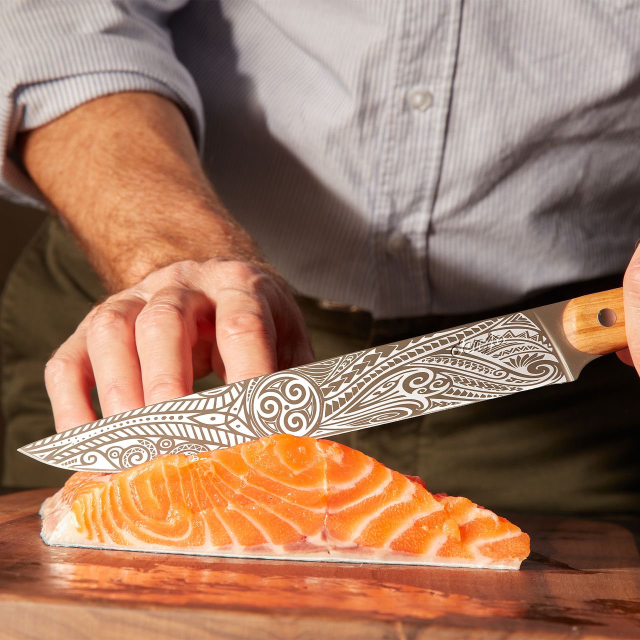 Fidèle à l’ADN Deejo, la beauté n’est pas un supplément d’âme : le manche en bois d’olivier massif, aux arabesques de beige et de miel, dialogue avec des tatouages exclusifs gravés sur les deux faces. Ces motifs ne décorent pas : ils signent une philosophie, remettre du sens et de la contemplation dans l’usage.