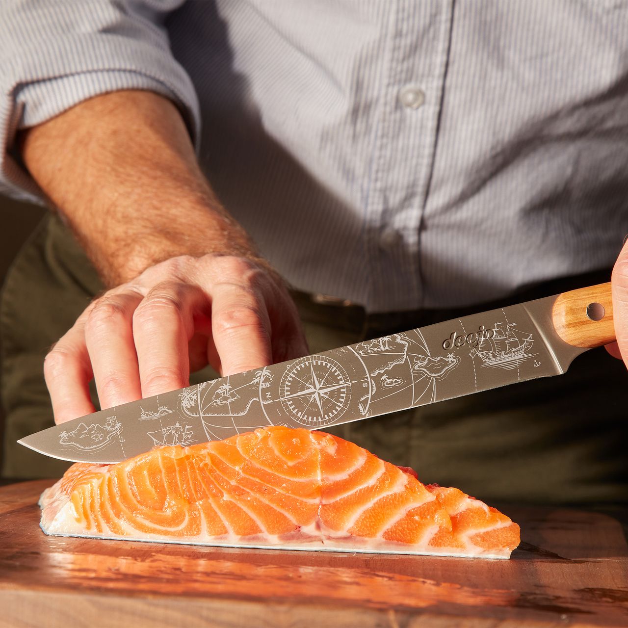 Fidèle à l’ADN Deejo, la beauté n’est pas un supplément d’âme : le manche en bois d’olivier massif, aux arabesques de beige et de miel, dialogue avec des tatouages exclusifs gravés sur les deux faces. Ces motifs ne décorent pas : ils signent une philosophie, remettre du sens et de la contemplation dans l’usage.