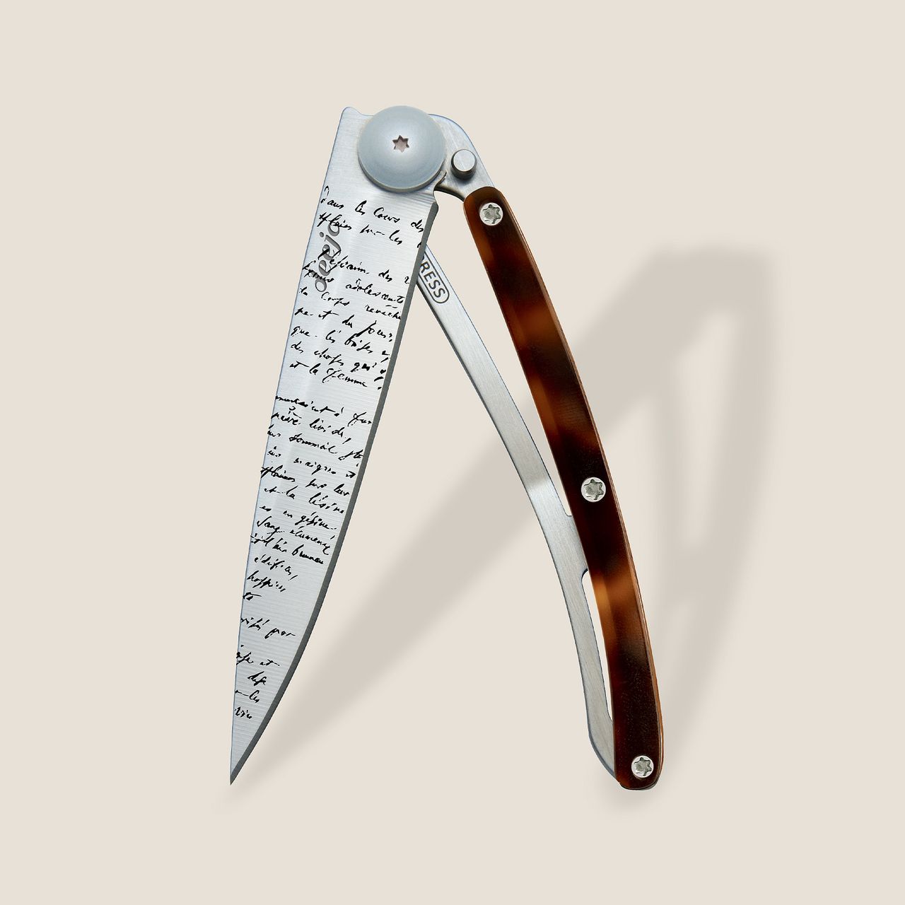 Mais ce n’est pas tout : facile à porter, à utiliser, à adopter, Deejo va au-delà du couteau en s’offrant la possibilité d’être « tatoué » : tatouer son couteau, comme l’on marquerait sa peau, c’est offrir à cet objet déjà très personnel, une tout autre dimension : son identité.
