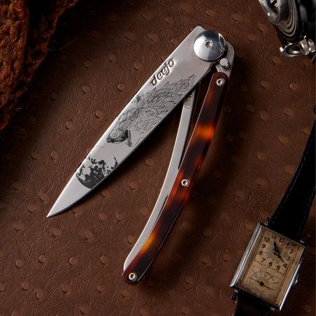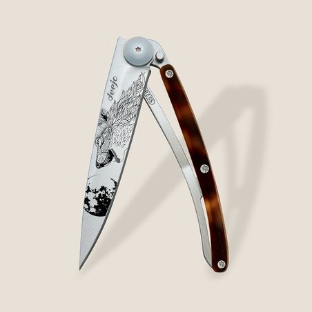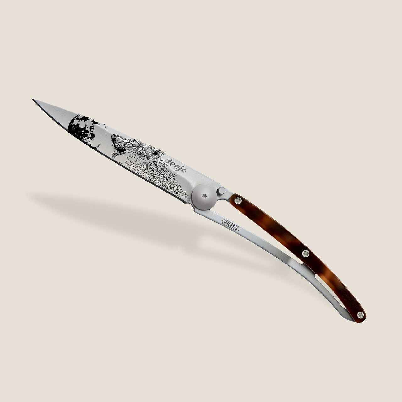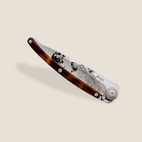 L’écaille de tortue qui orne nos couteaux Deejo est issue d’un matériau composite en acétate de cellulose principalement utilisé par l’industrie lunetière. Depuis des dizaines d’années cette matière synthétique remplace à s’y méprendre la véritable écaille de tortue. Robuste, lumineuse, cette matière qui se décline en autant de nuances que la nature compte d’espèces, se révèle un matériau de choix pour souligner parfaitement l’élégance de nos couteaux.