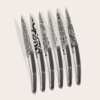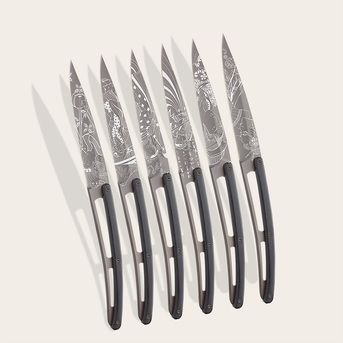 Et ce n’est pas tout : Deejo vous permet d’imprimer de délicats ornements sur vos couteaux de table. Des tatouages sur des couteaux, comme sur la peau, pour personnaliser chaque table. Inspirées par des thématiques variées, du printemps au mouvement Art déco, en passant par le Grand Siècle ou encore du Japon, ces illustrations entourent la lame dentée ou lisse de votre couteau.