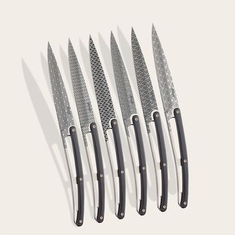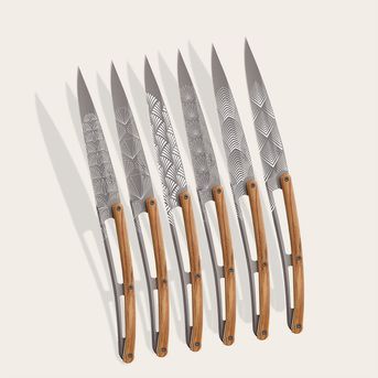 Le gris anthracite de la lame révèle des formes géométriques surprenantes inspirées du mouvement Art déco. Intemporels, ces couteaux de table trouveront leur place à côté des assiettes les plus raffinées, grâce à la noblesse de leur manche en bois d’olivier.