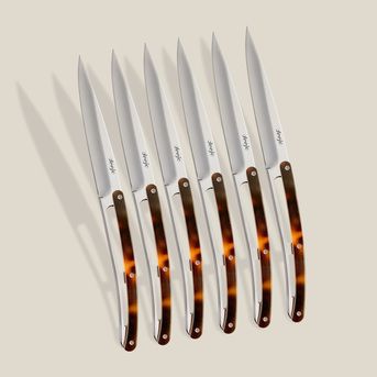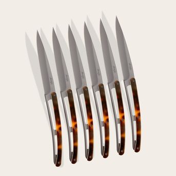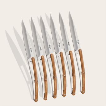 Aussi bien couteaux à steak que couteaux de table, ces Deejo vous offrent un confort rare à la faveur de tous type d’aliments. Vos convives seront éblouis par leur lame miroir, et leur manche façonné dans du bois d’olivier finement huilé.