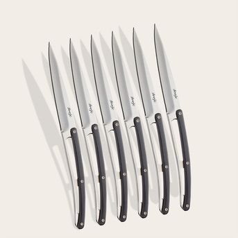 Avec leurs lames aux lignes minimalistes, ces couteaux de table vont vous plonger au cœur d'une belle ambiance rétro-contemporaine. Le manche en bois d’ébène noir allie à la fois confort et élégance. Ce set de couteaux de table sera l’élément phare de votre table.