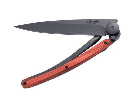 Belle lame que ce Deejo 27g black teinté de noirs et magnifiquement décorée ici d’une fine plaquette en bois corail tout en nuance de rouges.