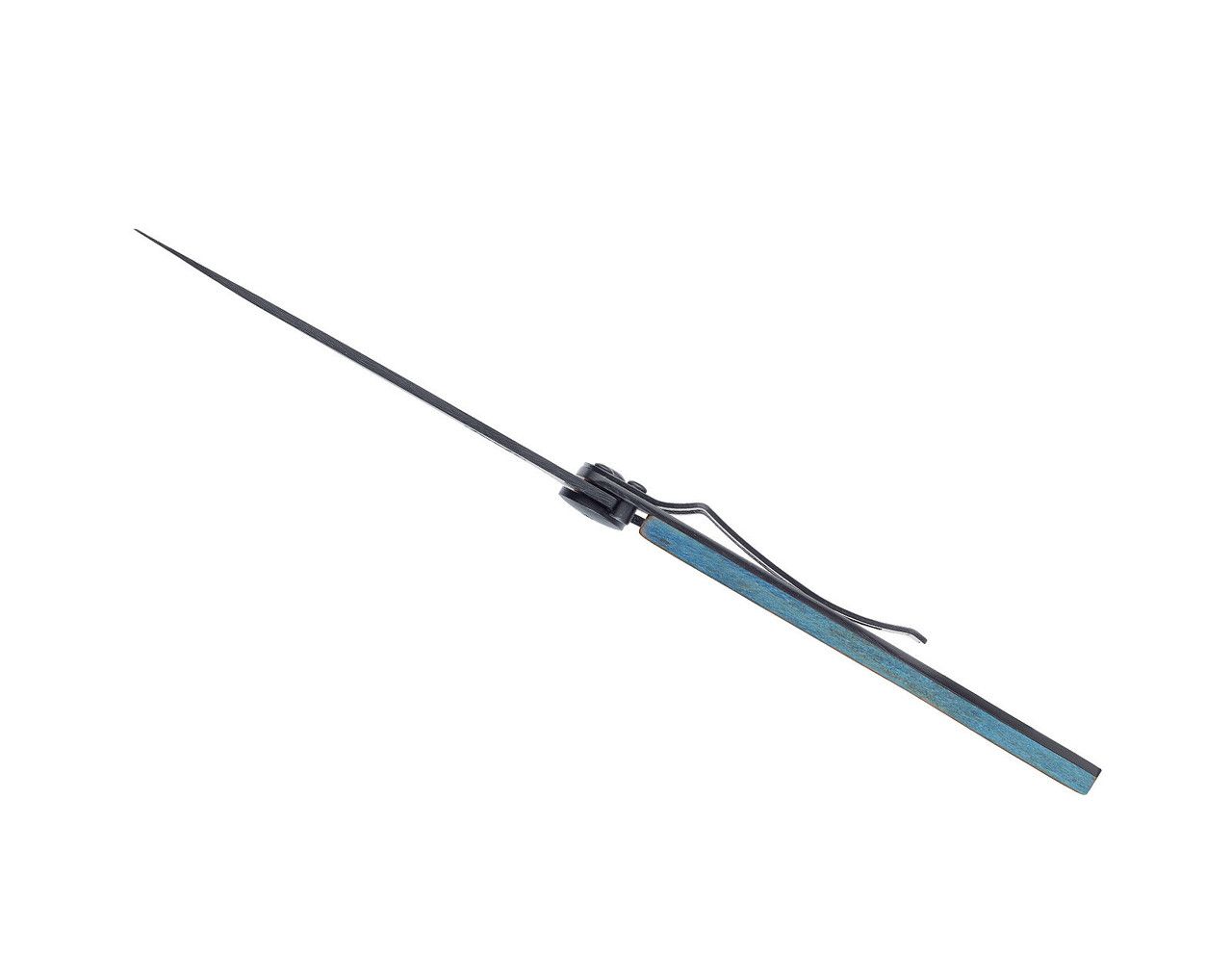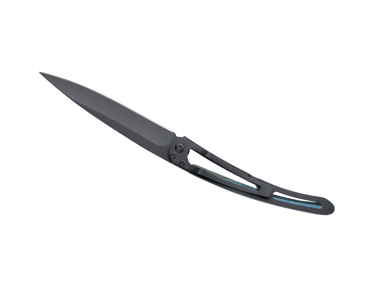 Pour le régal des yeux, un couteau Deejo 37 grammes tout en nuances de noirs orné d’une magnifique plaquette en hêtre massif teintés de bleus hésitants entre ciel et mer