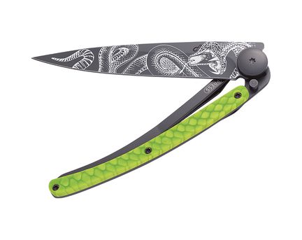 Sans doute l’un des Deejo les plus réussi de notre collection composite, dont le manche tout en nuance de verts épouse à merveille les courbes noueuses de ce reptile menaçant. Gardez le sang...