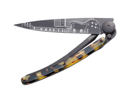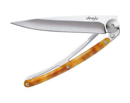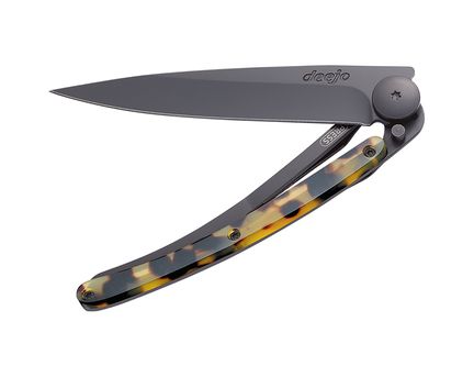 Taillé dans une feuille d’acétate épaisse, cette plaquette particulière dite « écaille de tortue » anoblie ici notre couteau Deejo avec brio.