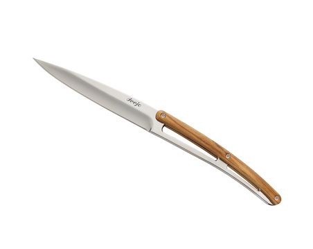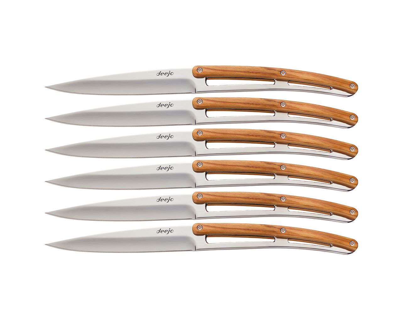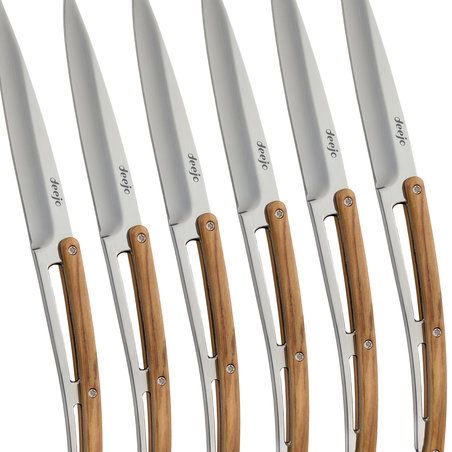 Un classique de la coutellerie revisité par Deejo ou les arabesques de l'olivier se jouent à merveille des reflets brillants de l'acier inoxydable : six couteaux de table d’une élégance rare.