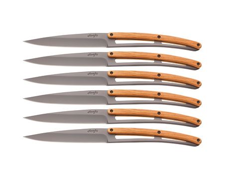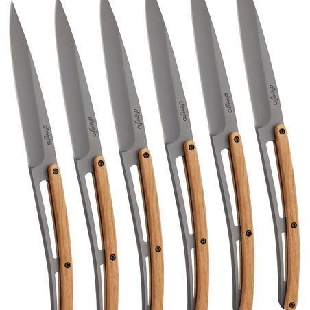 Ensemble de 6 couteaux de table à lame fixe (non pliant) en acier inoxydable 420, finition titane gris anthracite. Le manche est orné de part et d'autre d'une plaquette en bois d'olivier.La chaleur caractéristique du bois d'olivier, finement nervuré, contraste ici merveilleusement avec les lignes modernes et tranchantes de ces couteaux de table résolument ancrés dans le XXIème siècle.