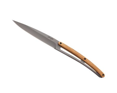 Deejo bouleverse les codes de la coutellerie traditionnelle à travers cette finition titane dont les aplats gris profond contrastent à merveille avec la chaleur noble du bois d’olivier.