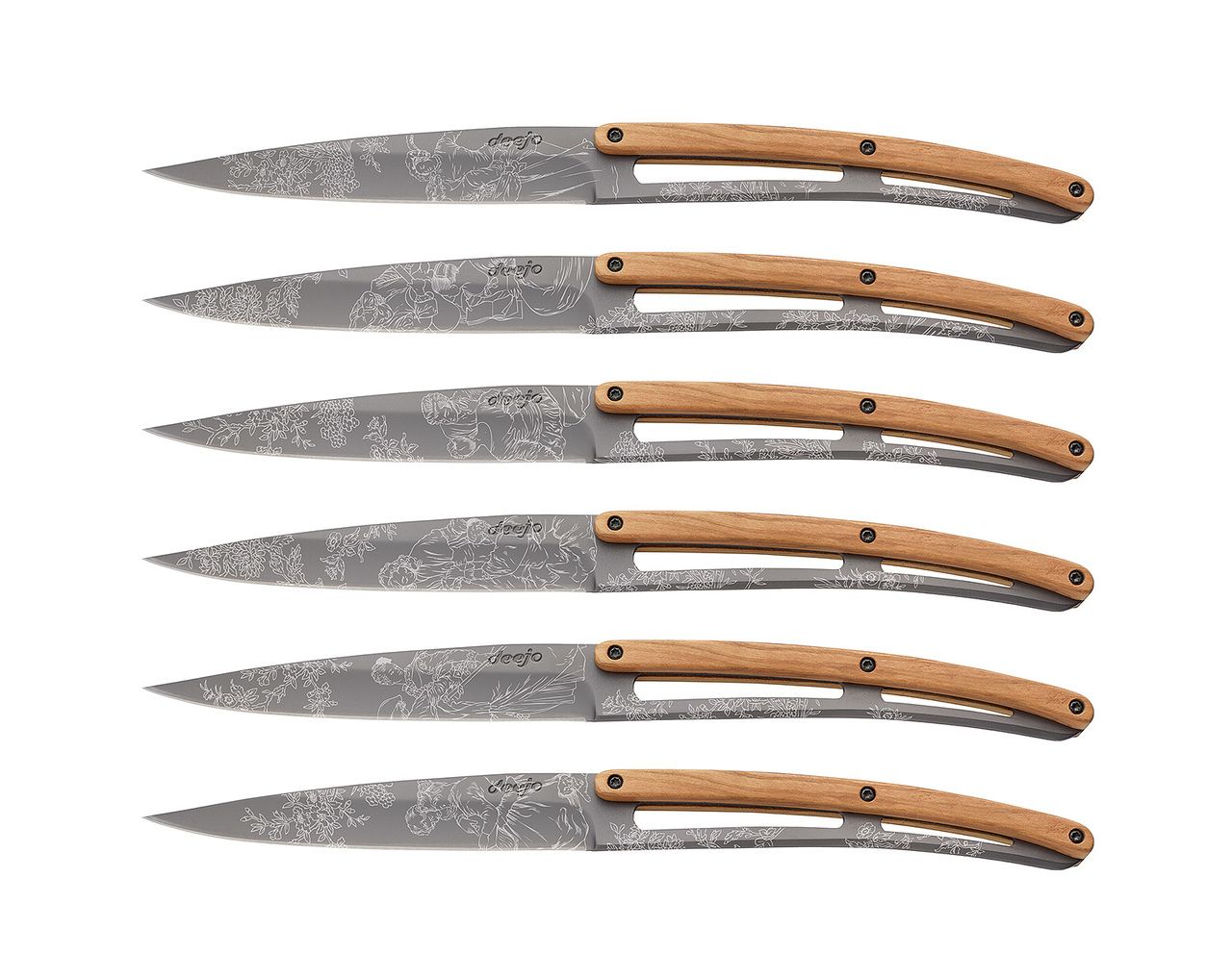 Ensemble de 6 couteaux de table à lame fixe (non pliant) en acier inoxydable 420, finition titane. Chaque lame est décorée d'une fine gravure au laser, présentant 6 motifs d'une même collection mais différent les uns des autres. Le manche est orné de part et d'autre d'une plaquette en bois d'olivier.La chaleur caractéristique du bois d'olivier, finement nervuré, contraste ici merveilleusement avec les lignes modernes et tranchante de ces couteaux de table résolument ancré dans le XXIème siècle.