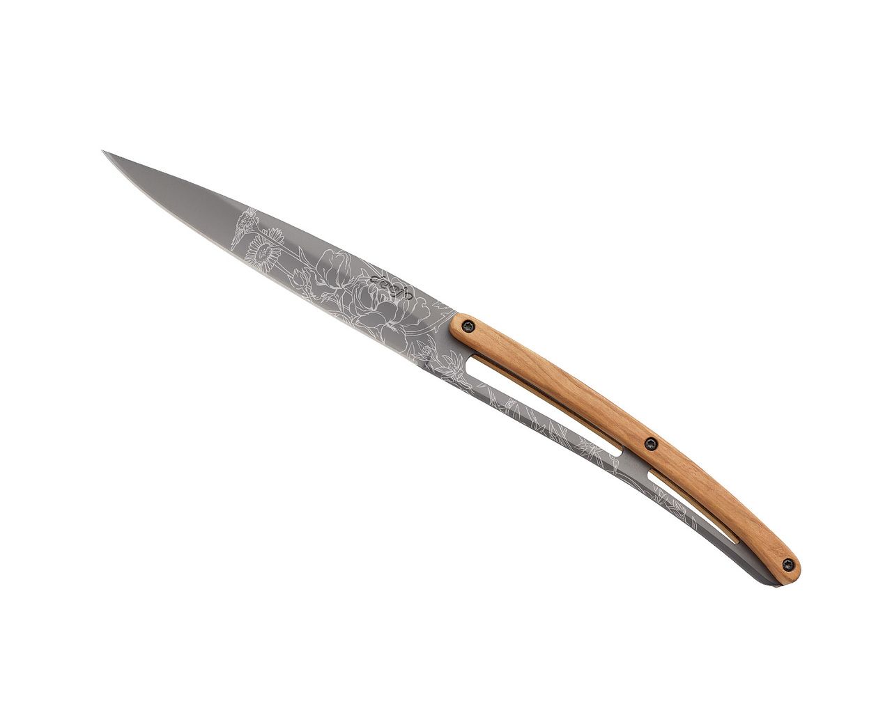 De bois et d’acier, nos fine lames s’illustrent ici à travers un motif fleuri remarquablement mis en lumière par la finition sombre du titane. Un Must.