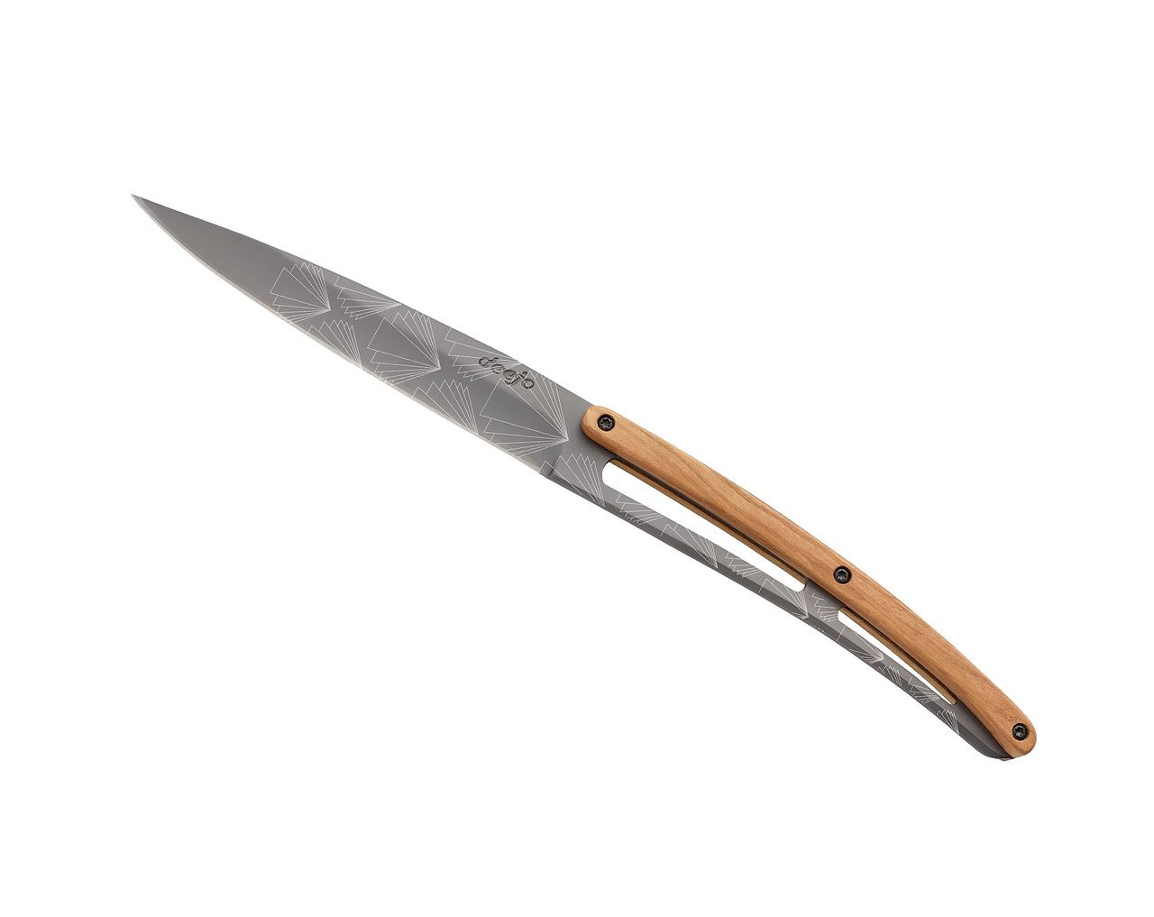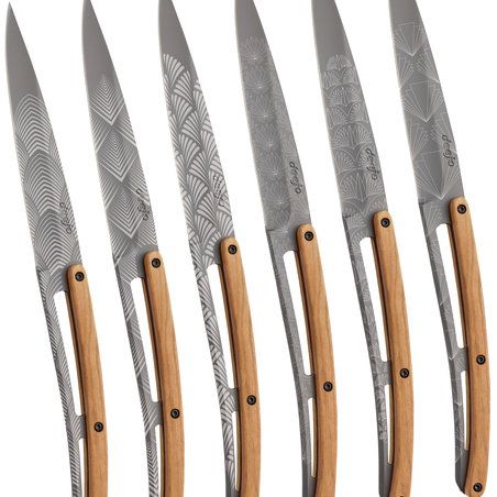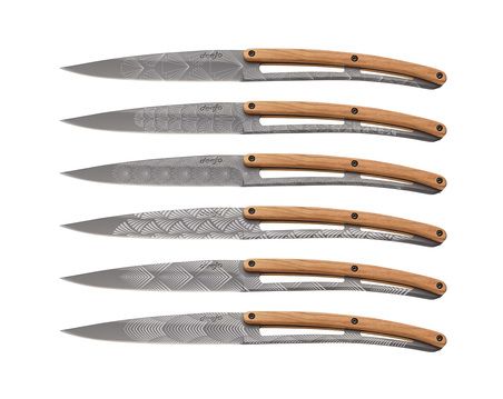 Ensemble de 6 couteaux de table à lame fixe (non pliant) en acier inoxydable 420, finition titane. Chaque lame est décorée d'une fine gravure au laser, présentant 6 motifs d'une même collection mais différent les uns des autres. Le manche est orné de part et d'autre d'une plaquette en bois d'olivier.La chaleur caractéristique du bois d'olivier, finement nervuré, contraste ici merveilleusement avec les lignes modernes et tranchante de ces couteaux de table résolument ancré dans le XXIème siècle.