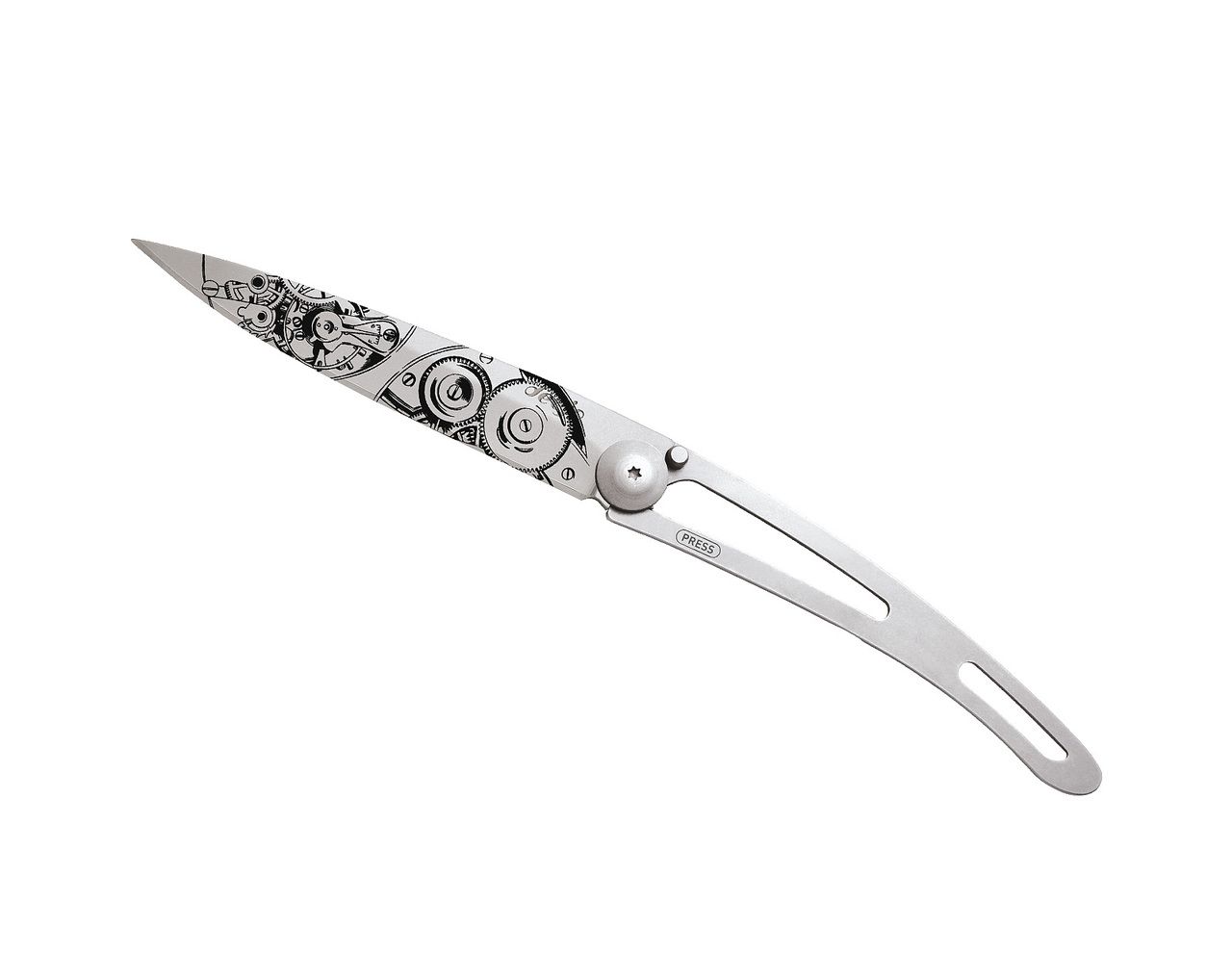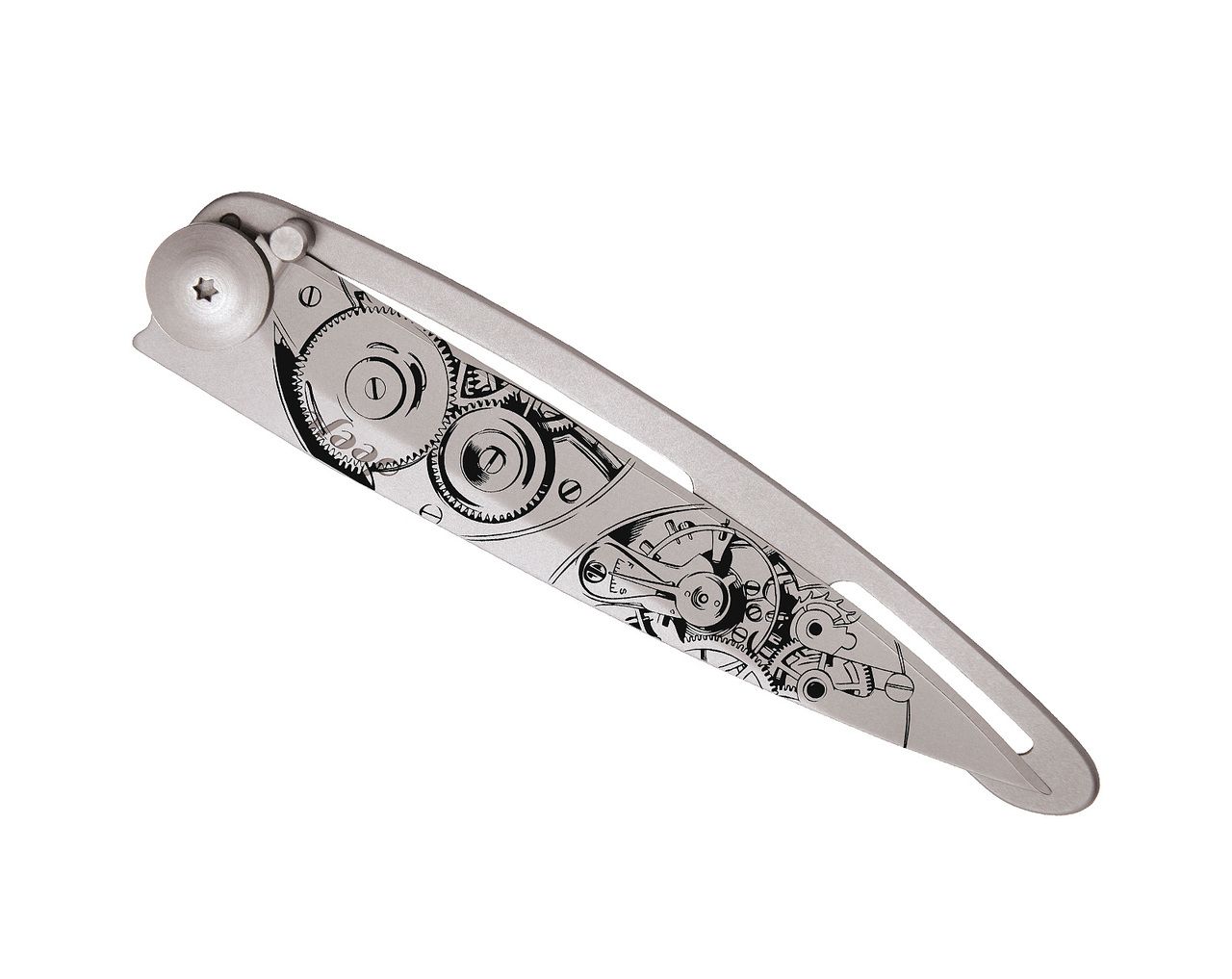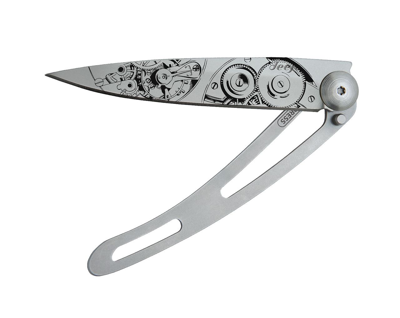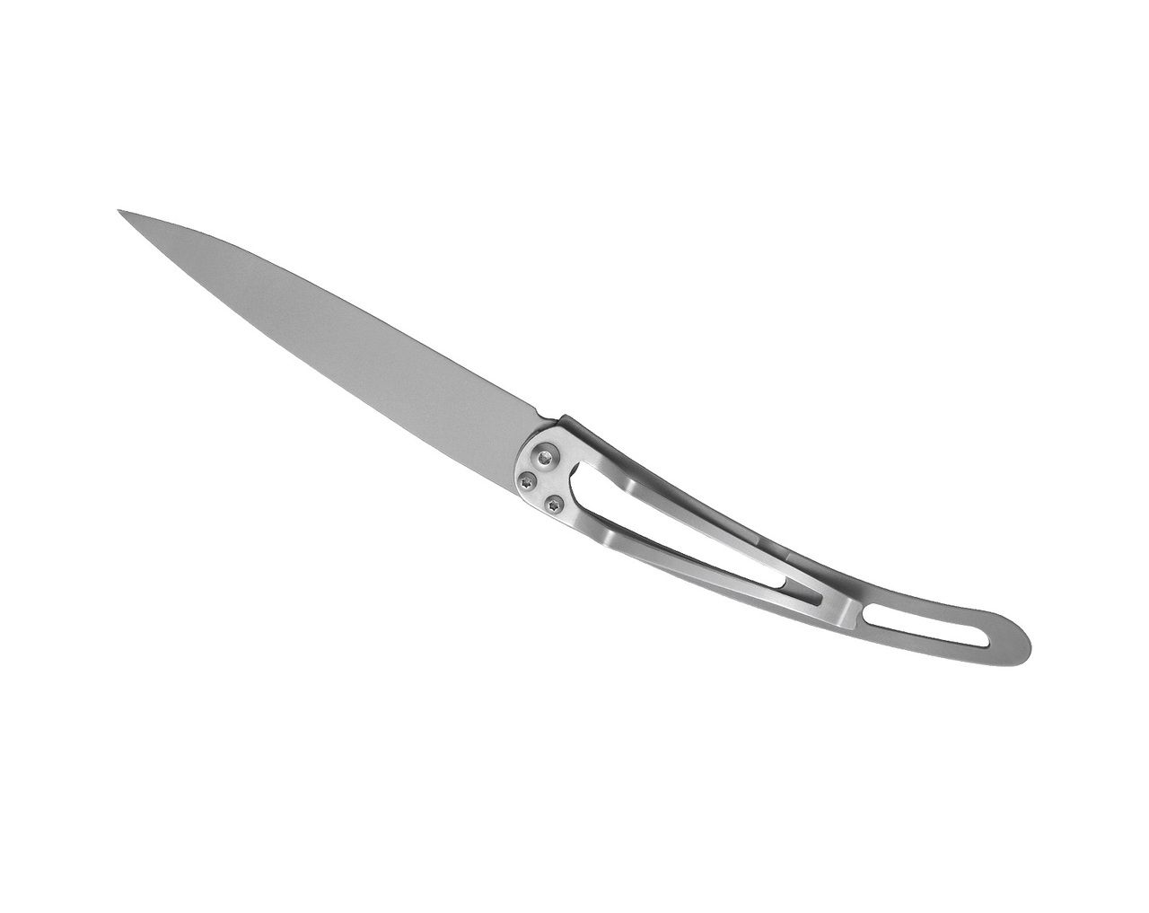 "Couteau ultra léger en acier inoxydable 420, finition miroir. Lame avec cran de sécurité de type ""liner lock"" décorée d'une fine gravure au laser. Affûtage de la lame en chisel (lame affutée que d'un seul côté). Clip de ceinture."