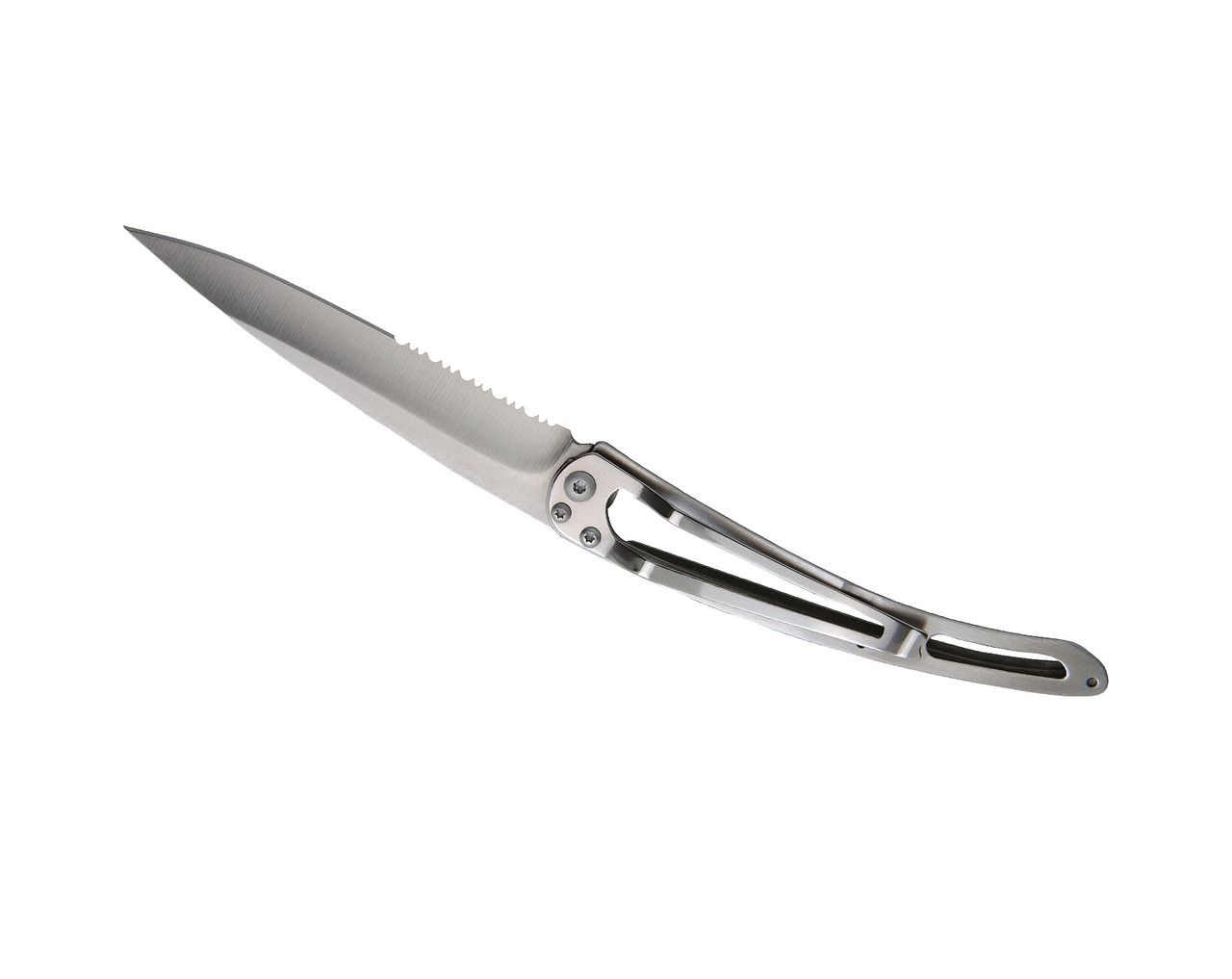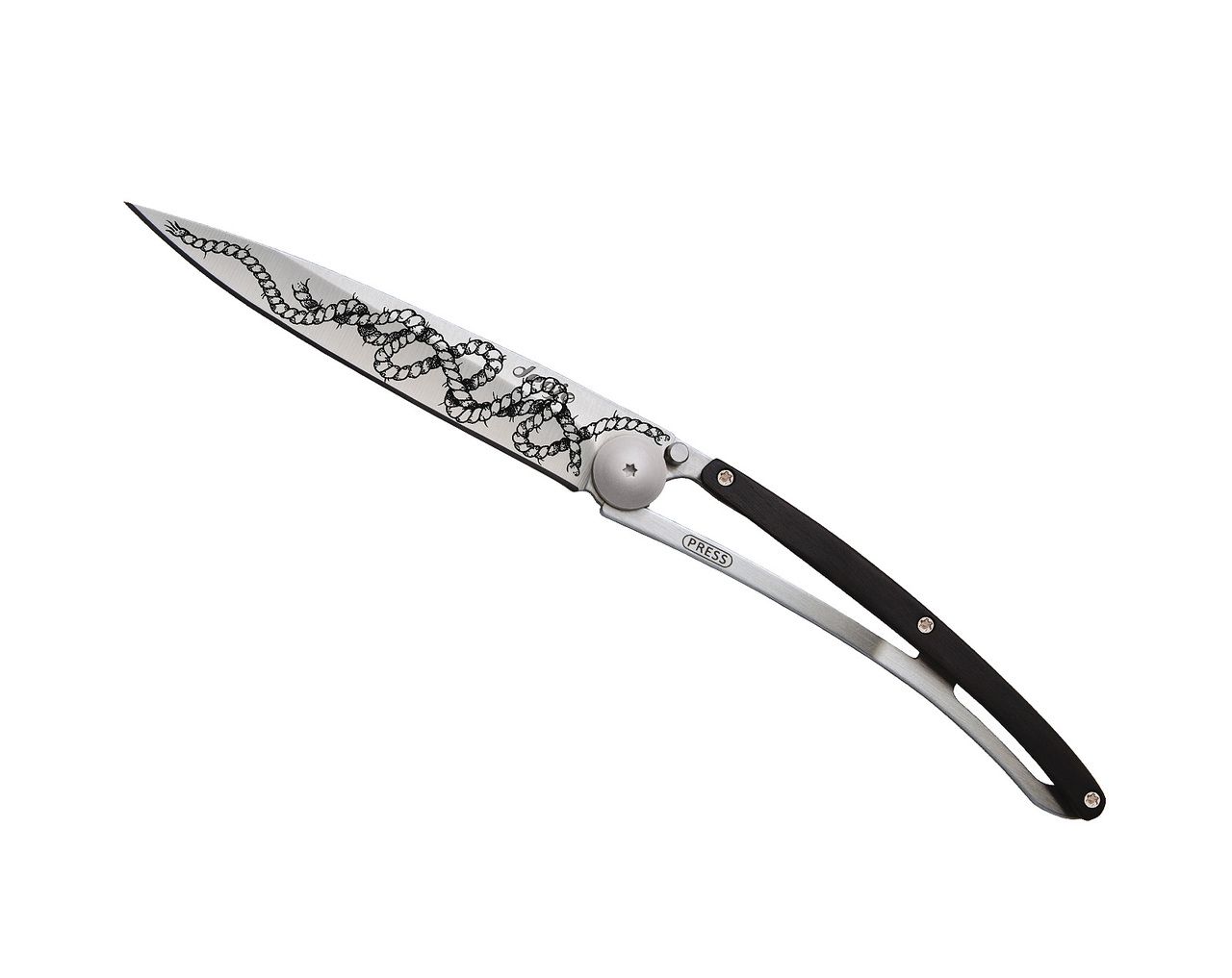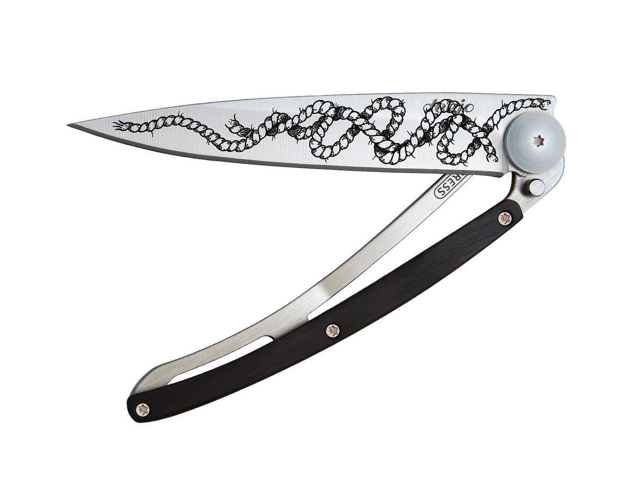 "Couteau ultra léger en acier inoxydable 420, finition mat. Lame avec cran de sécurité de type ""liner lock"" décorée d'une fine gravure laser. Clip de ceinture. Le manche est orné d'une plaquette en bois d'ébène.Le bois d’ébène, apprécié visuellement pour ses noirs profonds, a en outre la particularité d'être pratiquement insensible à l’humidité ambiante. Cette essence de bois s’avère être ainsi la plus dense, la plus résistante et la plus précieuse qui soit, idéale pour cette magnifique pièce de coutellerie."